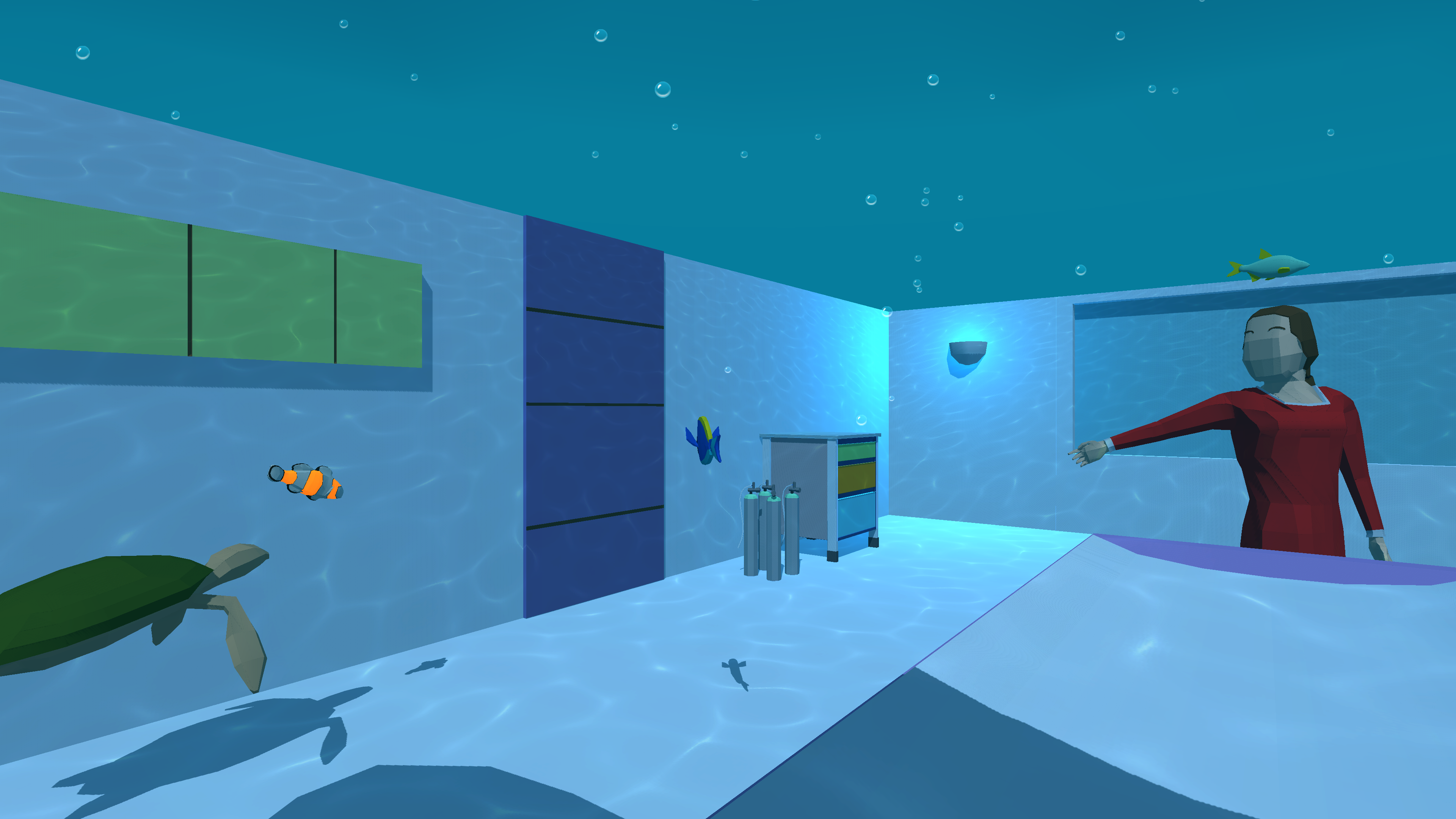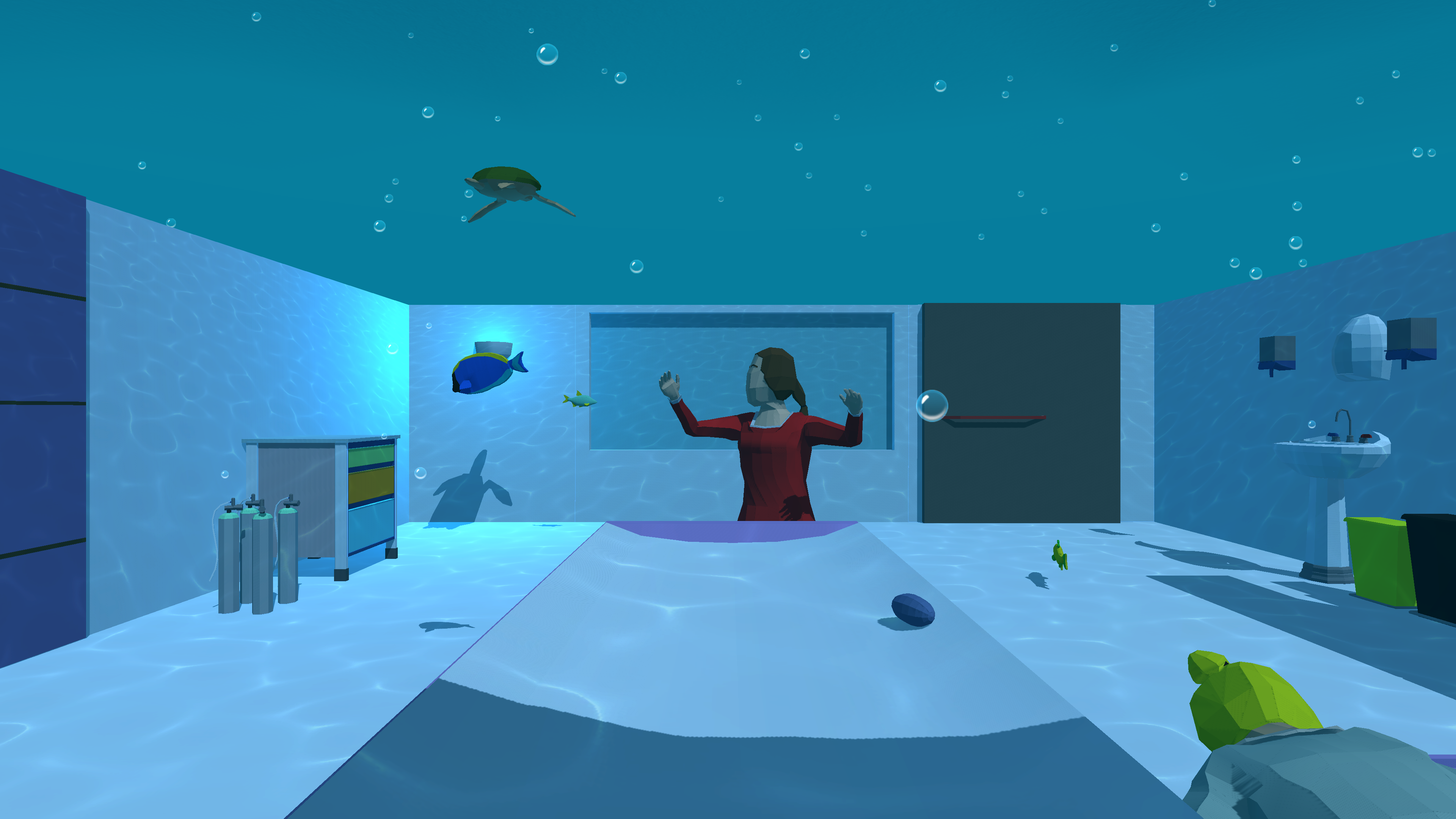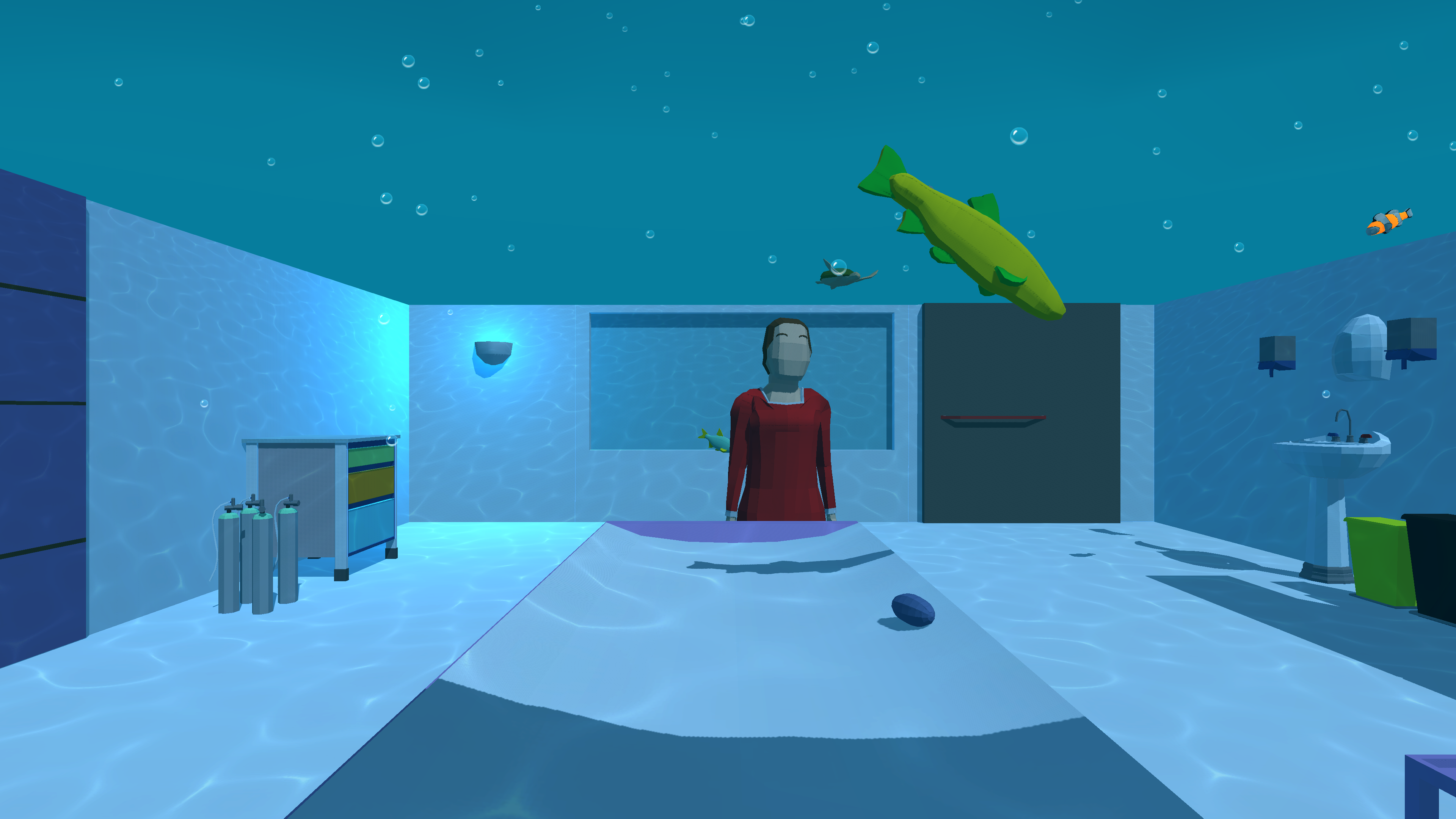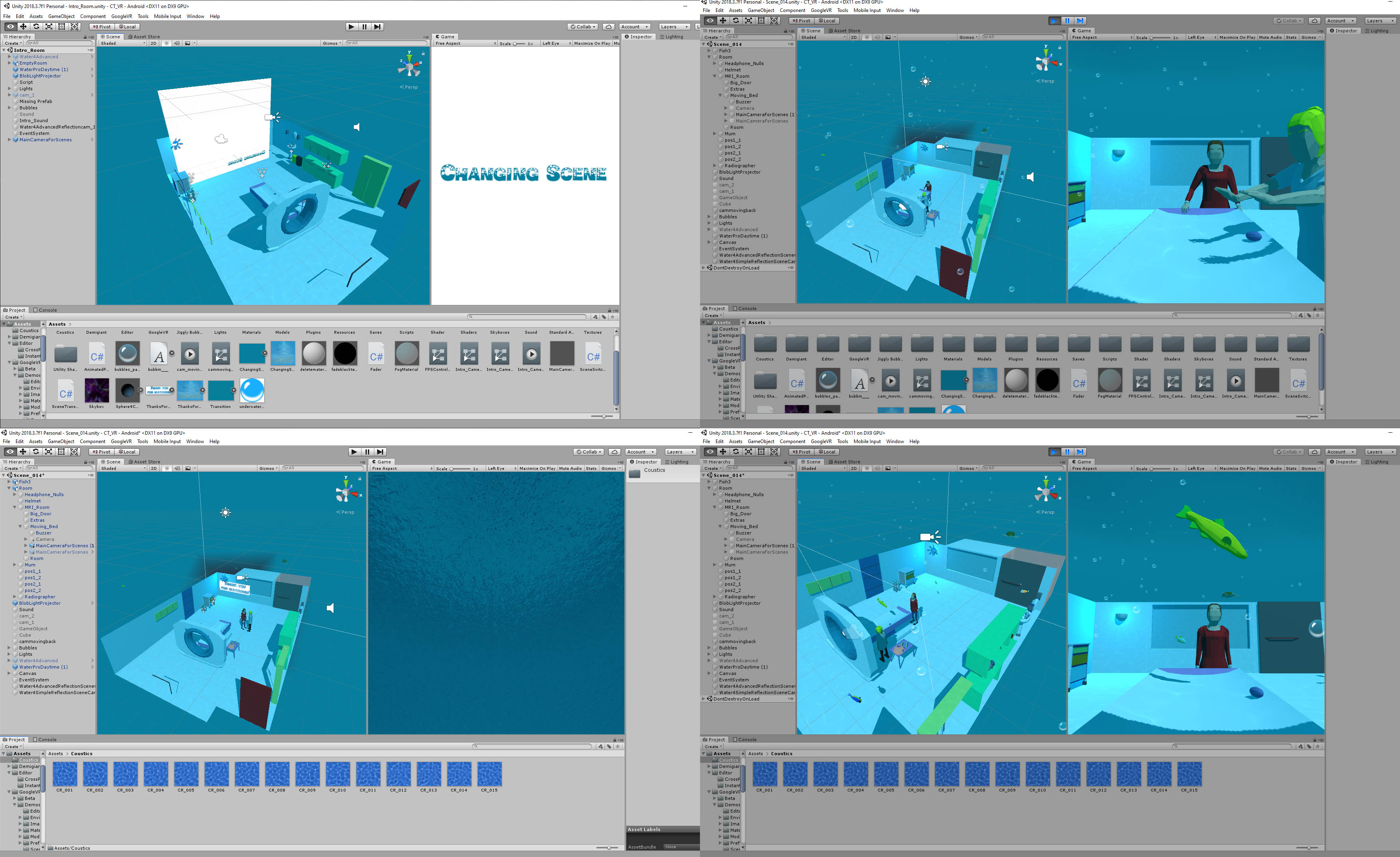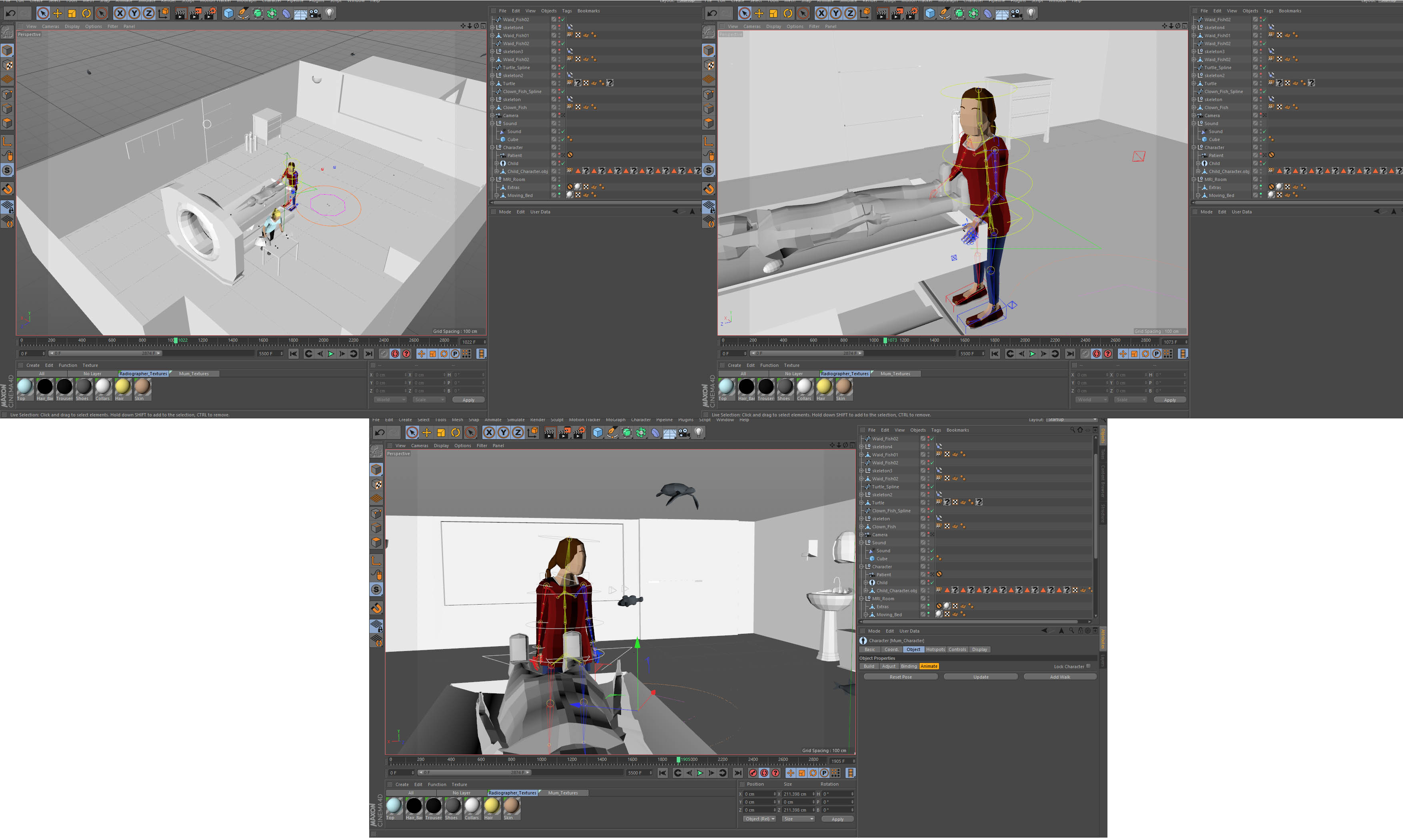 -Idea: Shows the procedure so the patients are aware and informed about the whole MRI process, and are less anxious beforehand. The patient is taken through the procedure by the animated Radiographer and voiceover narrative. Later on in the project, the sea-life emerge and swim around the patient, creating a calming and relaxing experience.